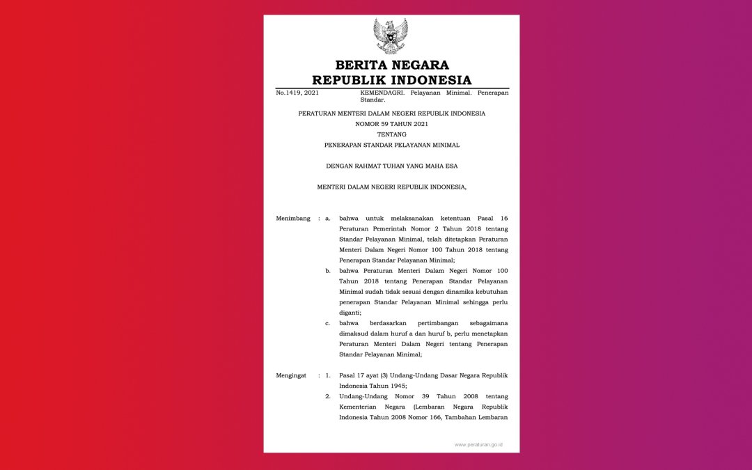 Peraturan Menteri Dalam Negeri Nomor 59 Tahun 2021 mengatur penerapan Standar Pelayanan Minimal (SPM) sebagai kewajiban pemerintah daerah dalam penyelenggaraan pelayanan dasar pada urusan pemerintahan wajib. Regulasi ini diterbitkan untuk memperkuat pemenuhan hak dasar warga negara melalui standar layanan yang terukur, terintegrasi, dan berorientasi pada capaian kinerja, sekaligus menyempurnakan pengaturan sebelumnya.